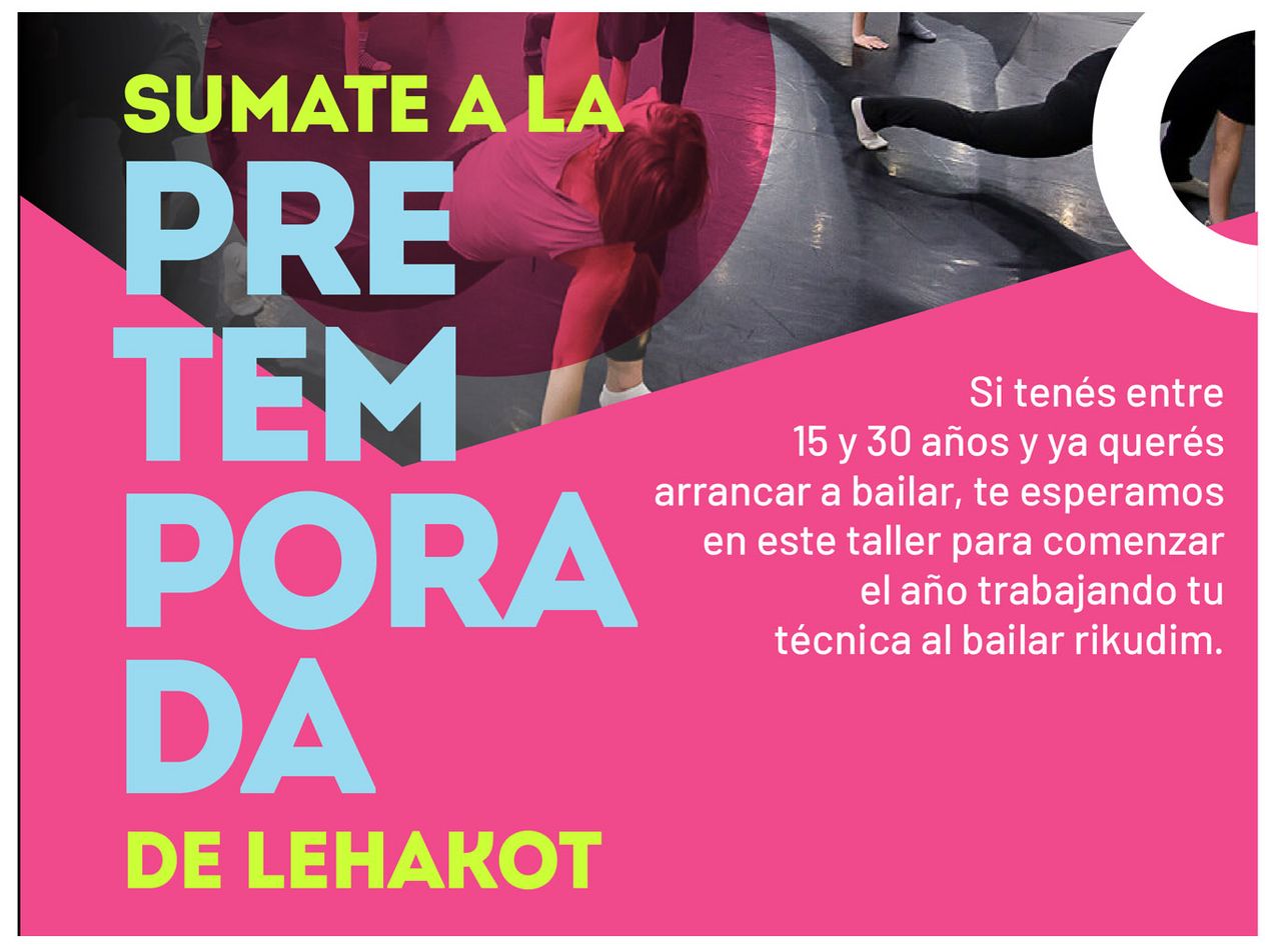 ¡Sumate a la pretemporada de Lehakot 2026!Si tenés entre 15 y 30 años te esperamos en este taller para mejorar la técnica aplicada en coreografías de rikudei-am. Morot: