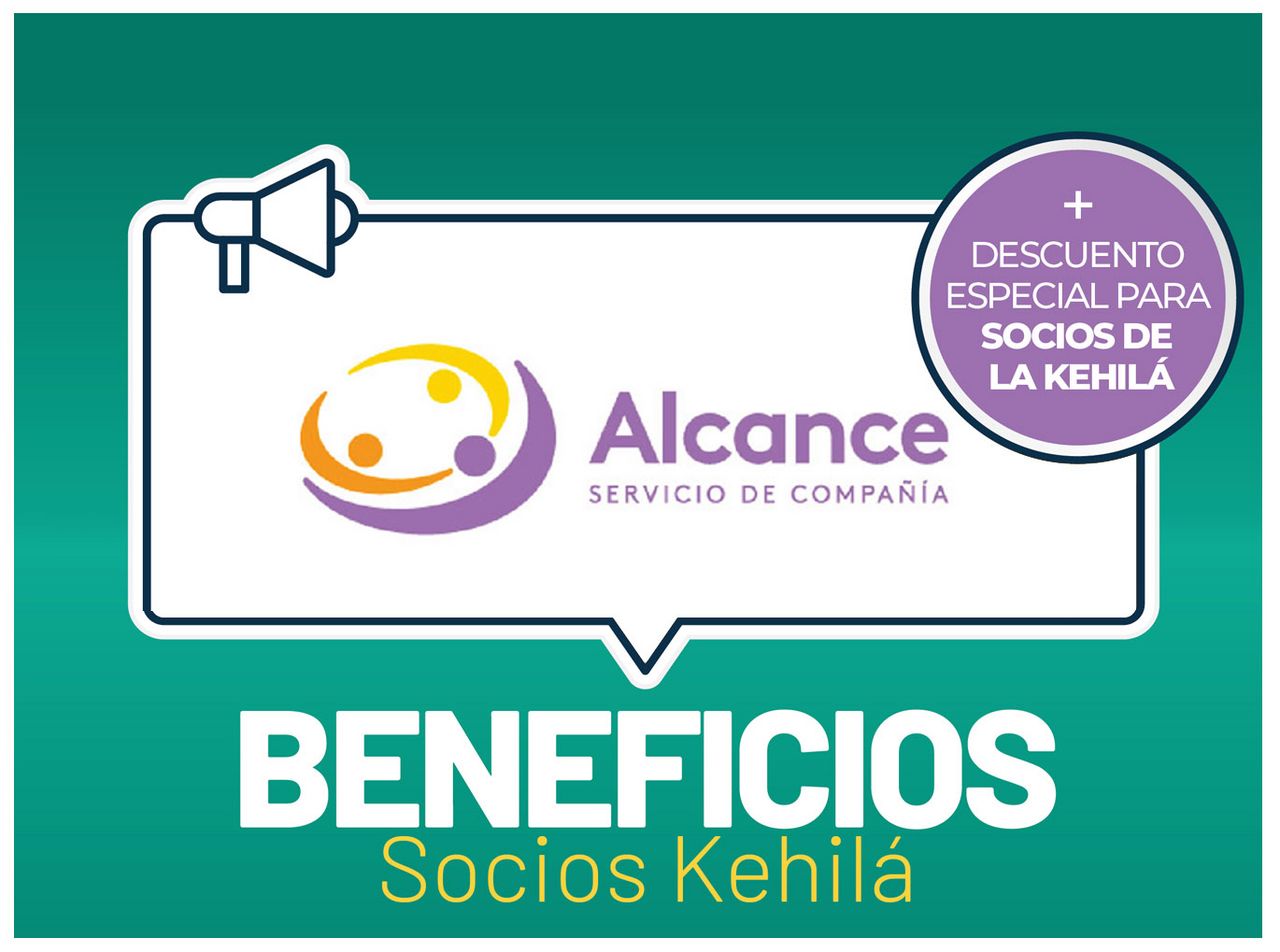 Ser parte de la Kehilá es también acceder a más beneficiosJunto a Alcance – Servicio de Compañía, ofrecemos una Promo Verano. 12 meses con 40% OFF. Además de esta Promo Verano, los socios de la Kehilá acceden a un DESCUENTO ESPECIAL ADICIONAL EXCLUSIVO. Asesoramiento: Maximiliano Terán – 095 885 244 - 0800 2902 | alcance.com.uy |