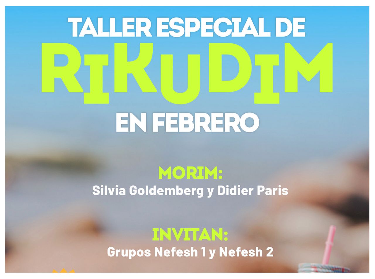 ¡Arrancamos el año bailando!Te invitamos a ser parte del Taller de Verano de Rikudim 2026. Te esperamos todos los miércoles de enero y febrero en la Kehilá con mucha música y energía. (Las fechas de cada encuentro están especificadas en el formulario) Miércoles - 19:30 a 21:30 hs. En la Kehilá. Morim/ot: Fede, Jorge y Tamara Inscripciones: a través del link, donde encontrarás toda la información sobre el sistema de cuponeras |