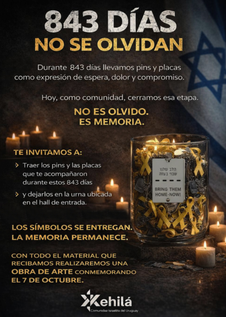 | Hoy, como comunidad, cerramos esa etapa. No es olvido. Es memoria.Los invitamos a participar y a ser parte de esta construcción colectiva. Porque los símbolos se entregan, pero la memoria permanece. Hoy, junto a la Kehilá, queremos transformarlos en una obra de arte colectiva con un profundo significado: una obra en formato de Jai. El Jai representa la vida, la continuidad y la esperanza, valores centrales de nuestra identidad. Cada pin y cada placa que traigan será parte de esta obra, en memoria del 7 de octubre, como expresión de que seguimos eligiendo la vida. |